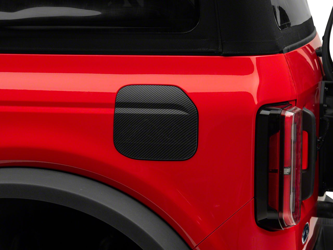 Rugged Styling. A simple and effective way to add rugged styling to the exterior of your 2021-2026 Ford Bronco is with a RedRock Fuel Door Cover that features a debossed Mountain Range design. This great looking, Matte Black Carbon Fiber Style Fuel Door Cover is an inexpensive way to upgrade the appearance of your exterior and it perfectly matches RedRock's complete line of other matte black carbon fiber exterior styling parts.