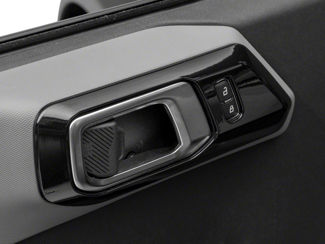 Application. These RedRock Interior Door Handle Trim Bezels; Gloss Black are designed to fit 2021-2025 Ford Bronco 4-Door models. Sold as a set of four, included front and rear.