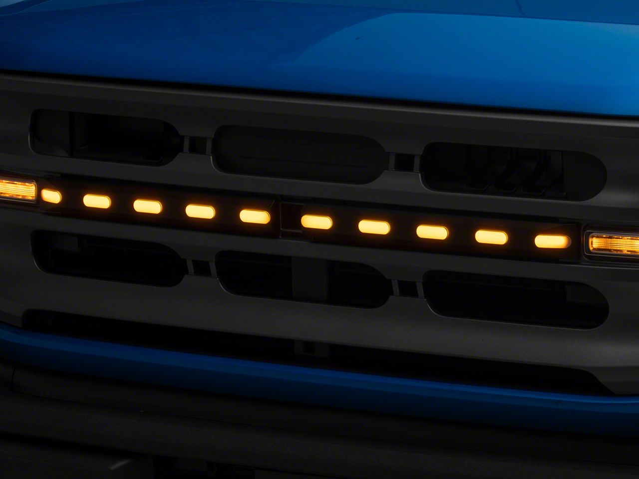 Grille Accent Lighting. Upgrade the appearance and more importantly the safety of your Ford Bronco with a RedRock LED Grille Lighting Kit. These uniquely shaped LED Grille Lights will automatically activate in conjunction with your running lights and can be switched between either amber or white via a selectable switch located in the engine bay. These Grille Lights not only look great, but will also make your Bronco more visible to other drivers at night or in poor weather conditions.