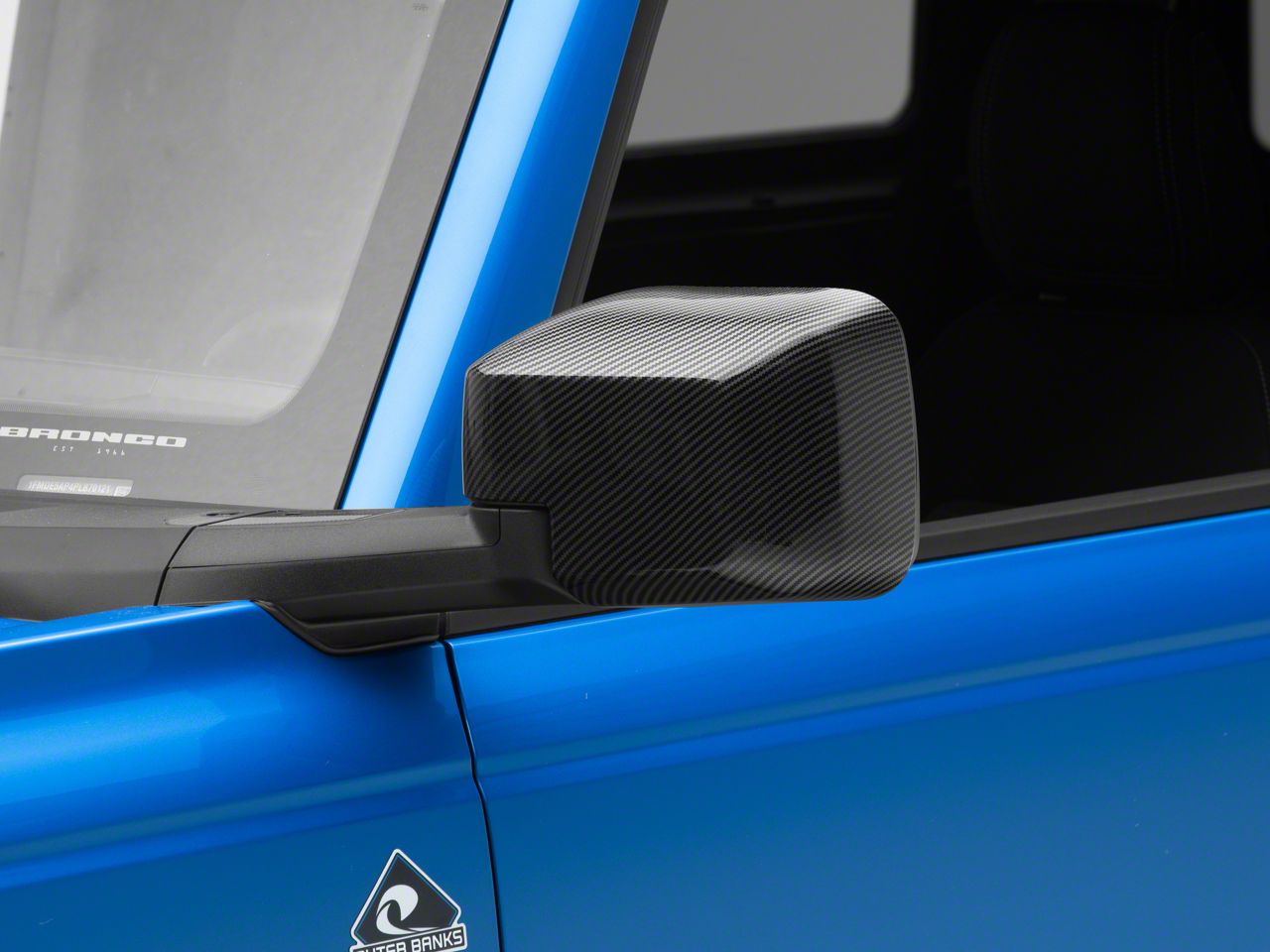 Application. These RedRock Mirror Covers; Gloss Black Carbon Fiber Style are designed to fit 2021-2026 Ford Bronco models. Driver and passenger side included.