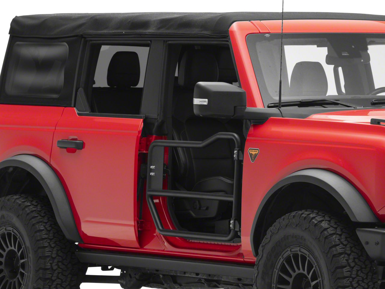 Off-Road Styling. A pair of RedRock Off-Road Tubular Front Doors are a great way to give your 4-Door 2021-2026 Ford Bronco the exciting bold looks of an off-road vehicle. These tubular Doors will give you the open air driving experience you love, while providing more safety than riding without doors alone. Besides fresh air, these Tubular Doors will help to increase your visibility which is ideal when you're trying to negotiating tough trails.