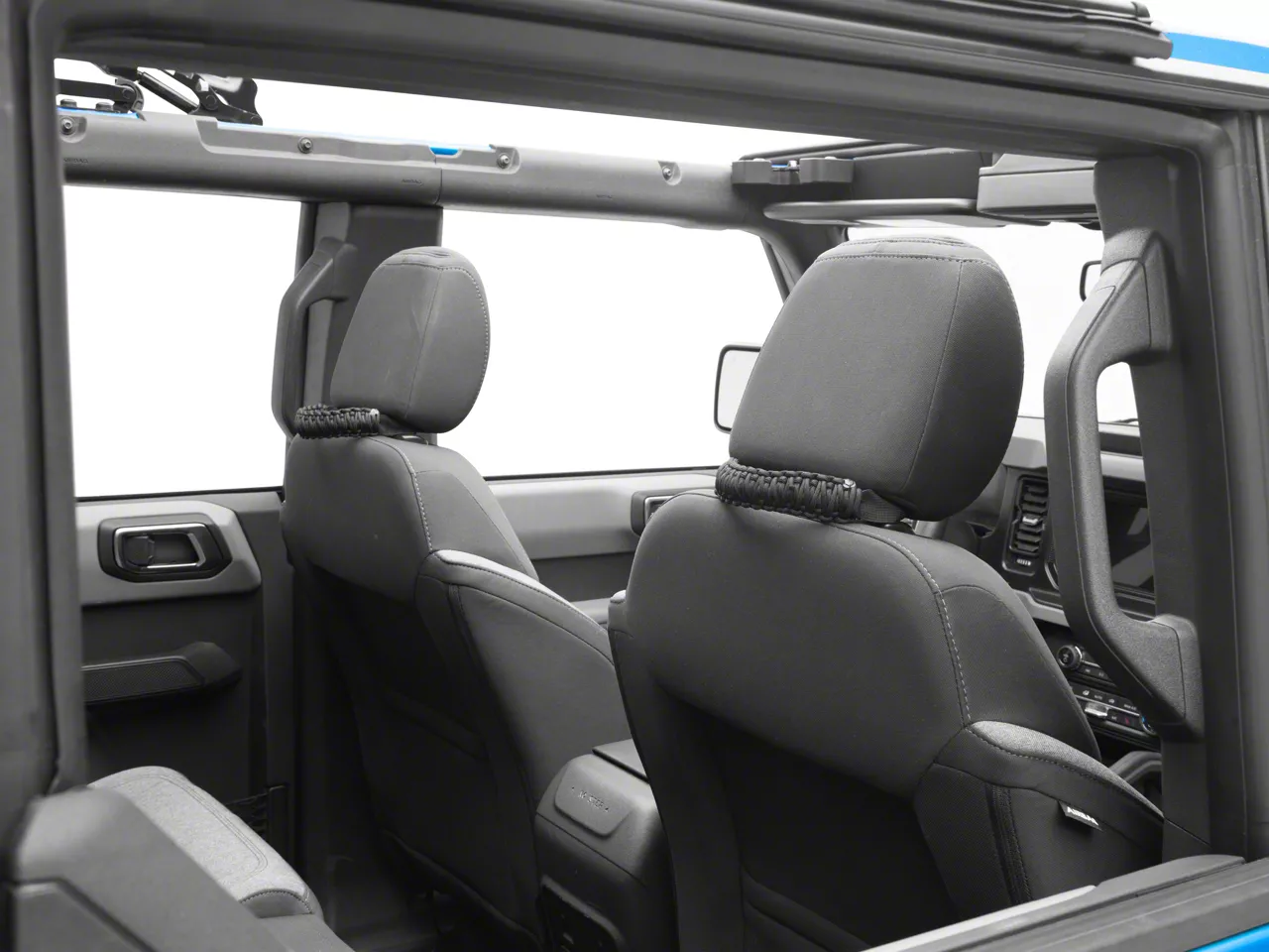 Application. These RedRock Paracord Headrest Grab Handles; Black are designed to fit 2021-2025 Ford Bronco models. Sold as a set of two.