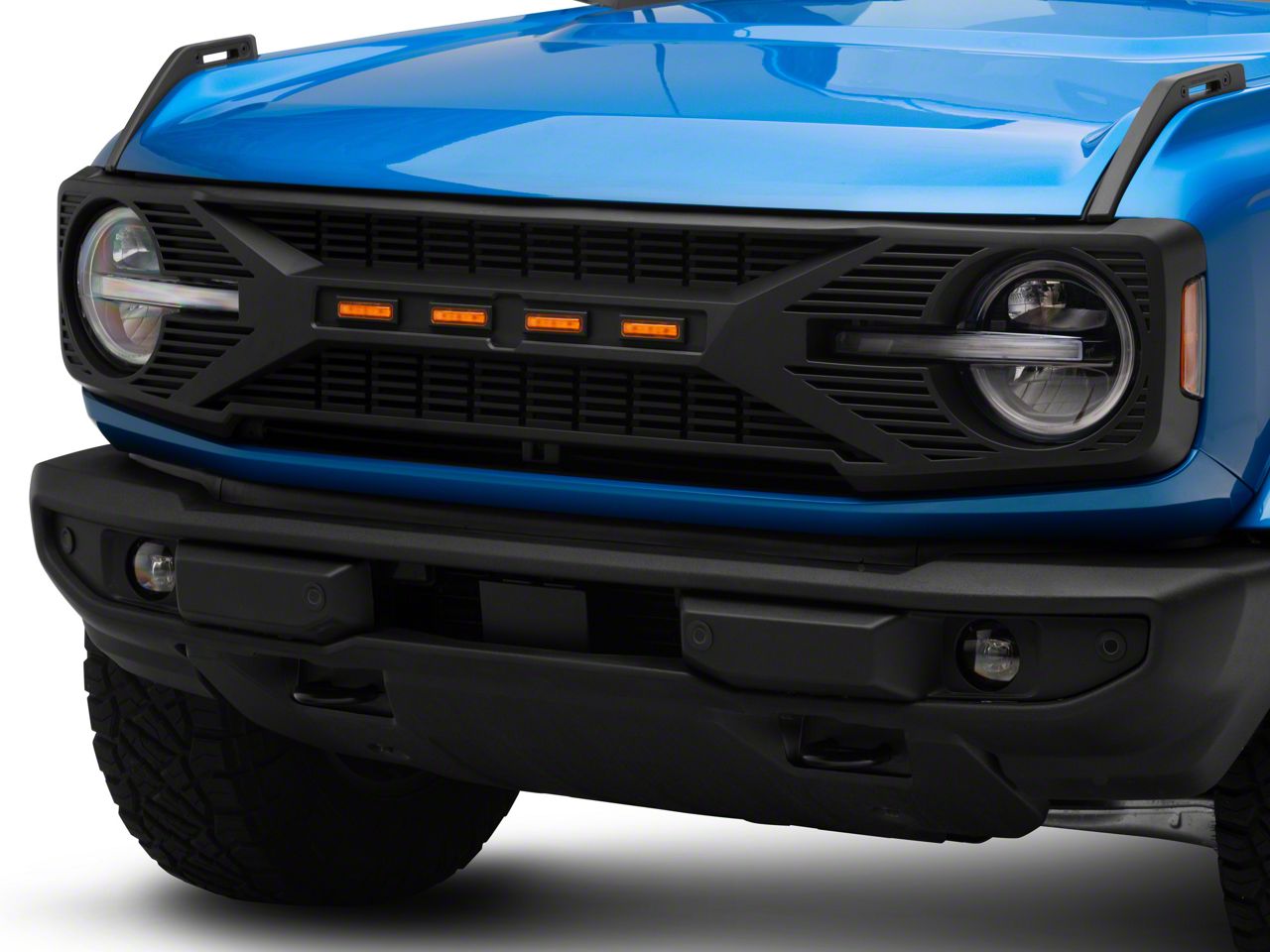 Application. This RedRock Tomahawk Grille with LED Lighting; Matte Black is designed to fit 2021-2025 Ford Bronco models, excluding Raptor. This is a replacement grille not an overlay. Not compatible with forward facing camera equipped models.