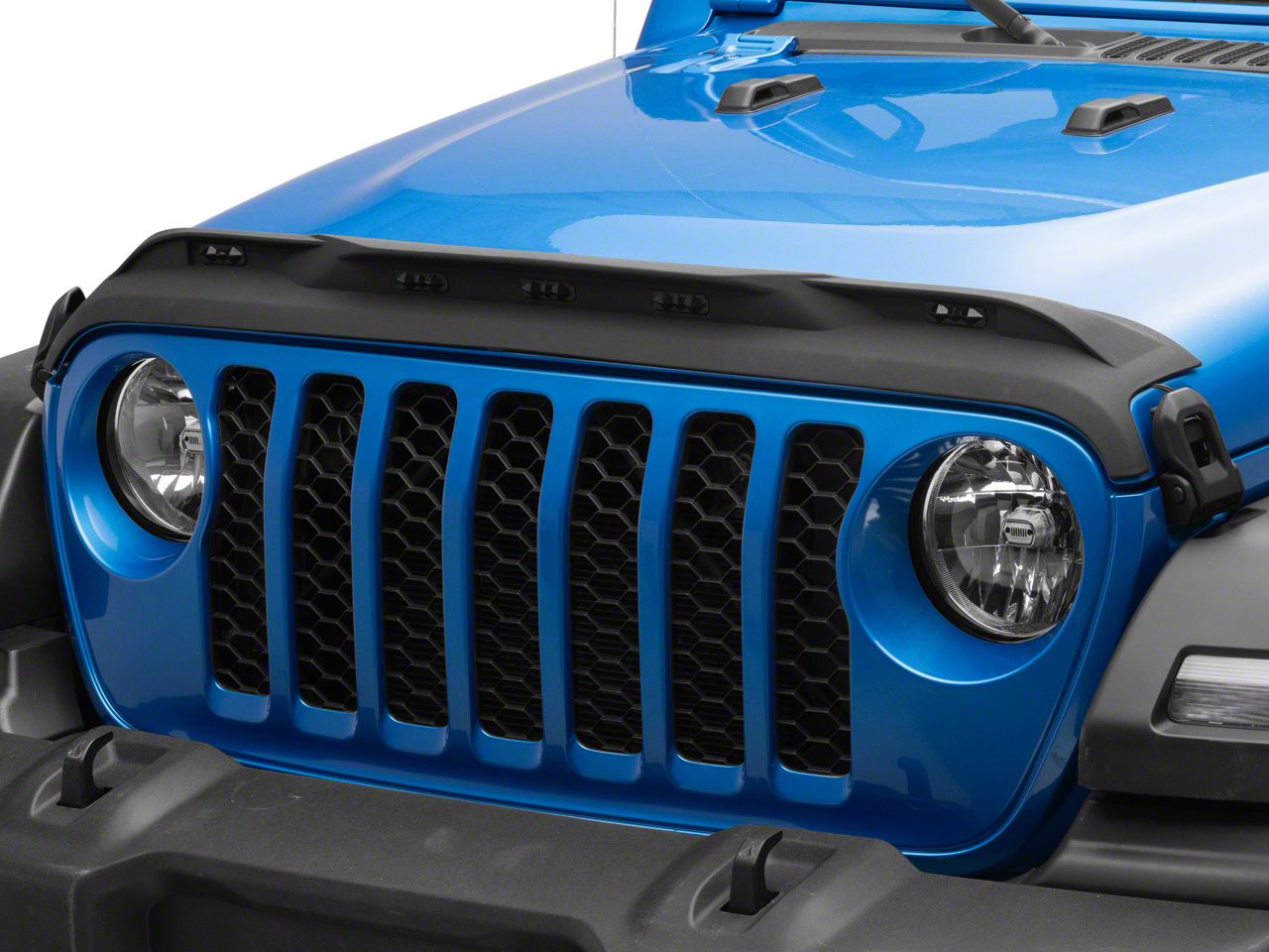 LED Running Lights. This Hood Guard also includes high mount amber LED running lights. These LED accent lights come with a wiring harness that simply splices into your Jeep's existing factory headlight harness. The LEDs will then automatically activate in conjunction with your running lights. The eye-catching LEDs not only look great, but will also make your Jeep more visible to other drivers at night and in poor weather conditions.