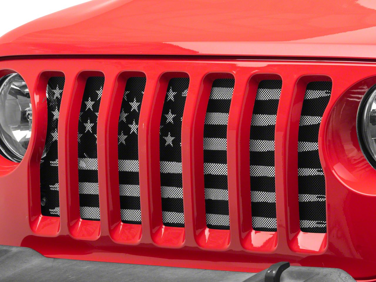 Patriotic Styling and Protection. A RedRock American Flag V2 Grille Insert is a great way to show your support for the good ole US of A, while adding extra protection to your JL Wrangler. Ideal for daily drivers and off road enthusiasts, this JL Grille Insert will protect your Wrangler's radiator from all types of trail hazards and road debris.