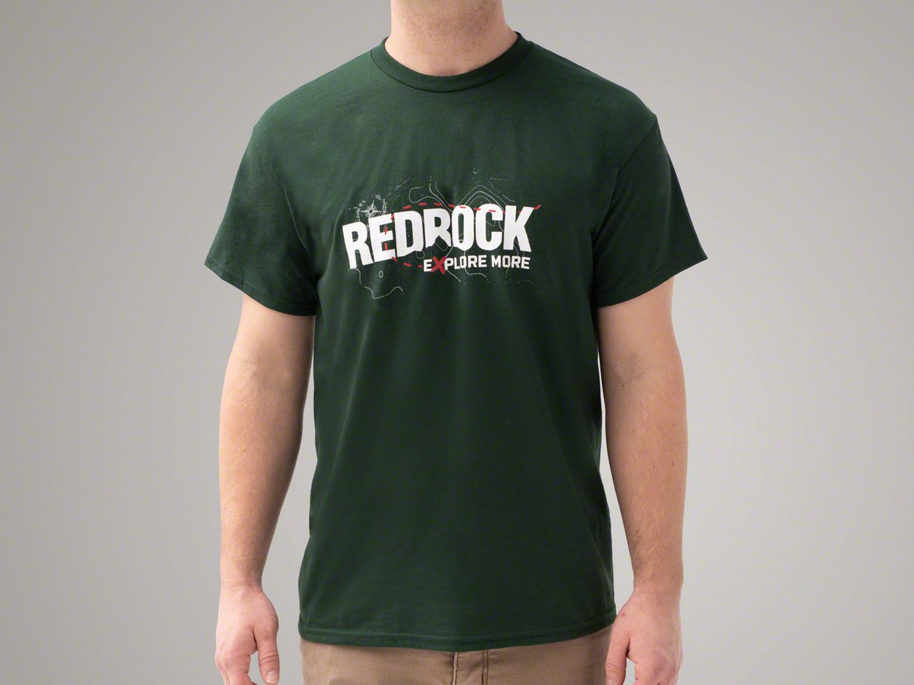 RedRock Explore More. Let everyone know whose parts you're running on your rig with a RedRock Explore More graphic T-Shirt. This dark green short-sleeved t-shirt features the RedRock logo across the front in bright white lettering over top of a topographic map design.