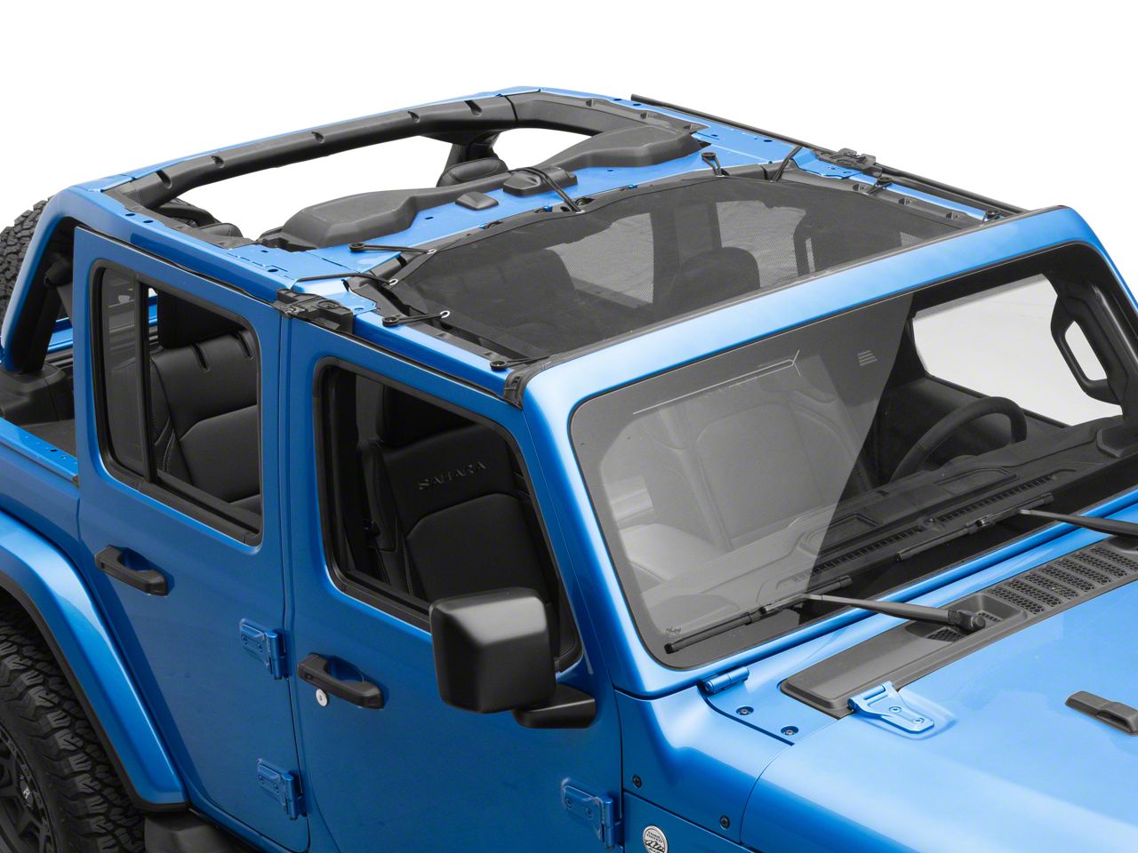 Application. This RedRock Mesh Sun Shade; Front; Black is designed to fit 2024-2026 Jeep Wrangler JL models.