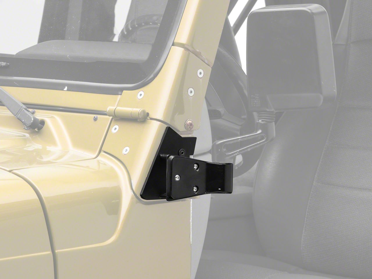 Relocates Mirrors From Door To Body. If you love driving your Jeep Wrangler around in the summer months without the doors you'll need a RedRock Mirror Mount Kit. This Mirror Mount Kit will relocate the stock mirrors from the doors to the windshield frame A-pillar keeping you street legal while improving your range of side and rear visibility at the same time.