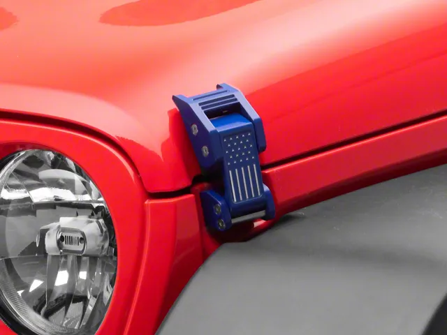 Application. This RedRock Old Glory Billet Hood Catch Kit; Blue is designed to fit 2007-2026 Jeep Wrangler JK and JL models.