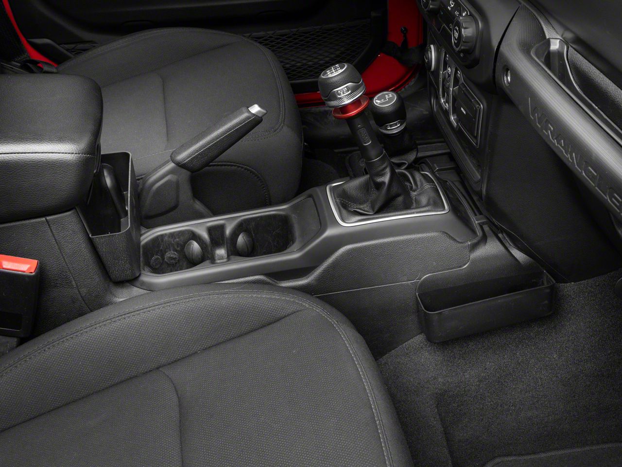 Organized Storage. The RedRock Storage Organizer Combo Kit creates more usable storage space in your Wrangler's interior for small items. This Combo Kit includes a Grab Handle, Center Console, and Center Arm Rest Storage Tray allowing you to separate and organize items, such as your sunglasses, smartphone, loose change and more.