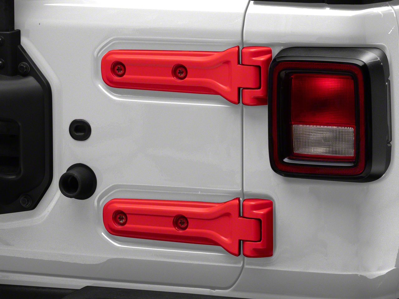 Application. This RedRock Tailgate Hinge Cover Kit; Red is designed to fit 2018-2026 Jeep Wrangler JL models. Sold as a four piece set.