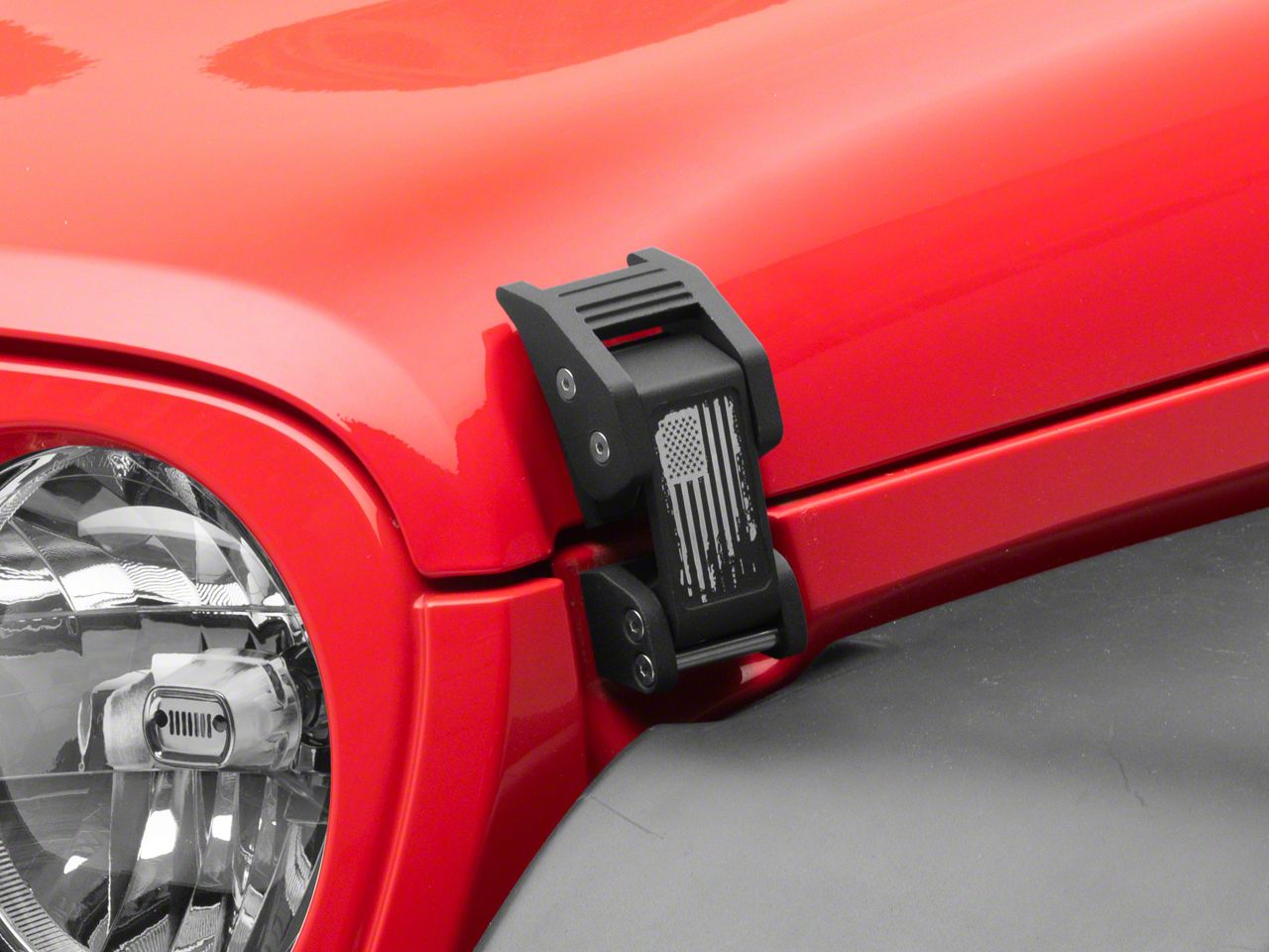 Eliminate Hood Flutter. Eliminate annoying hood flutter when driving your JL Wrangler on uneven roads and trails by installing a RedRock Hood Catch Kit. These sturdy catches have been designed to securely hold down your Wrangler's hood making flutter a thing of the past. Best of all these Hood Catches feature a patriotic distressed Stars and Stripes design.