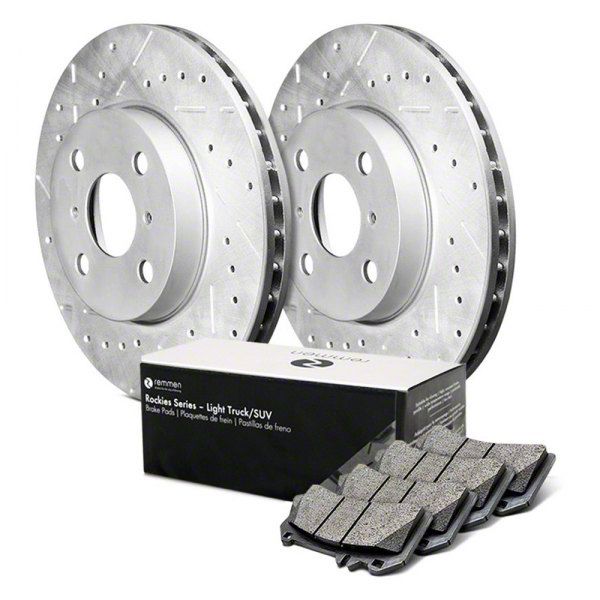 Superior Stopping. Enhance your vehicle's braking performance with the Remmen Brakes Rockies Series Cross-Drilled and Slotted 6-Lug Brake Rotor and Pad Kit. Designed to deliver superior stopping power, this kit includes a 0.63-inch rotor discard thickness and a 2.70-inch rotor height, ensuring optimal performance under demanding conditions.
