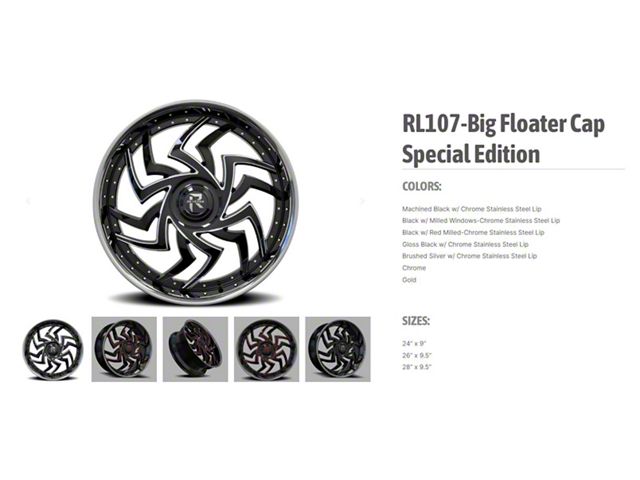 Revenge Luxury Wheels RL-107 Big Floater Chrome 6-Lug Wheel; 28x9.5; 25mm Offset. The Revenge Luxury Wheels RL-107 Big Floater Chrome 6-Lug Wheel; 28x9.5; 25mm Offset features a sleek and modern design that enhances the overall aesthetic of any vehicle. Its brushed gunmetal finish adds a touch of sophistication and complements various vehicle styles. This wheel's premium construction ensures durability and a robust appearance.