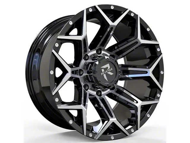 Revenge Off-Road Wheels RV-202 Black Machine 5-Lug Wheel; 20x10; -19mm Offset exudes sophistication with its finish, offering a sleek and modern appeal to any vehicle it adorns. The design is meticulously crafted to enhance the aesthetic of your vehicle, giving it a distinctive and upscale look. Perfect for those seeking to elevate their vehicle's style, this wheel blends seamlessly with both contemporary and classic vehicle designs, making it a versatile choice for a wide range of vehicles. Its robust construction ensures durability, making it a reliable choice for drivers who value both style and quality.