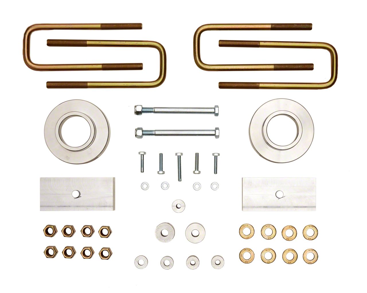 Contents. There are 2 rear blocks, 2 preload spacers, 4 U-bolts, 2 differential spacers, a rear line spacer and installation hardware.