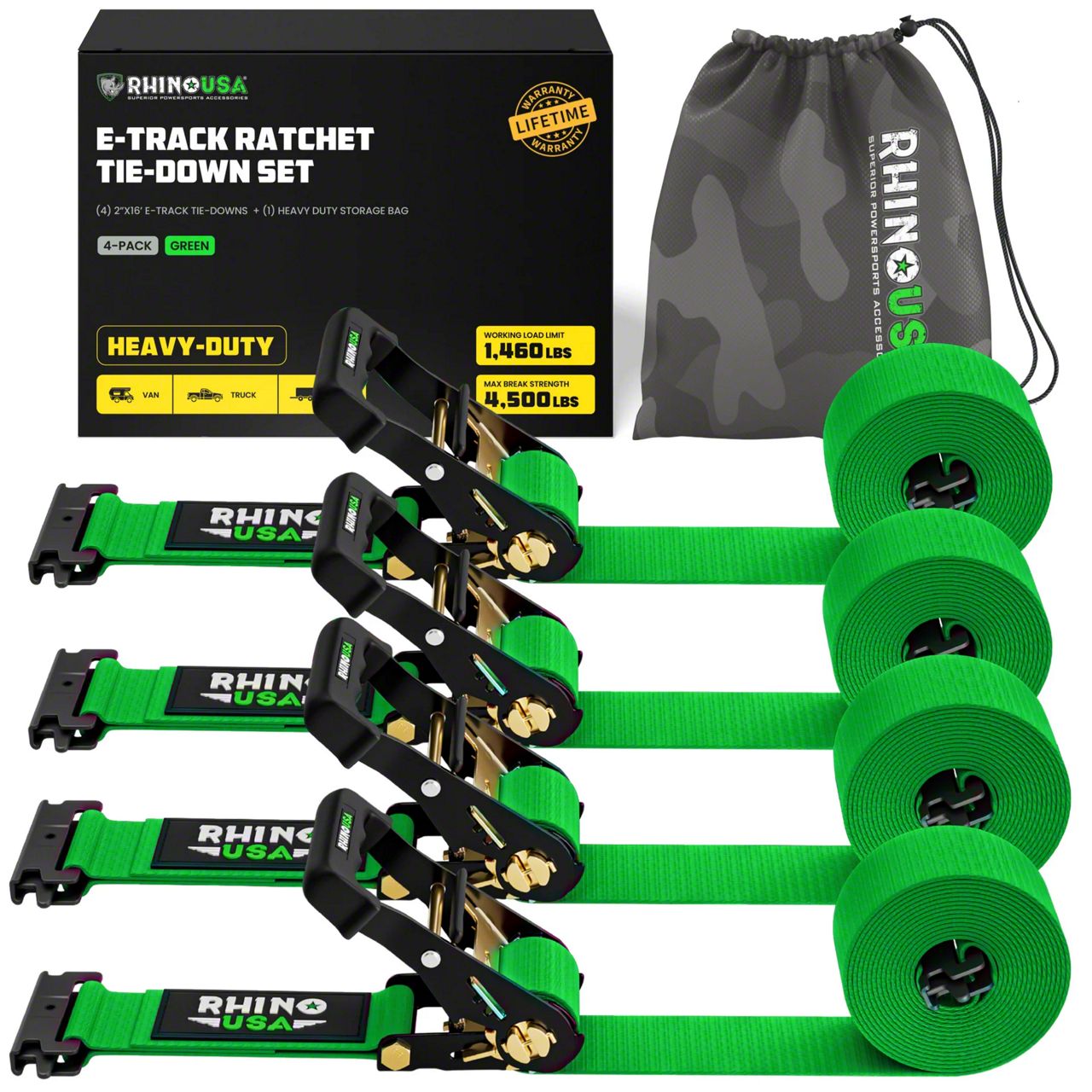 Rhino USA 2-Inch x 16-Foot E-Track Ratchet Strap Kit; 4-Pack; Green