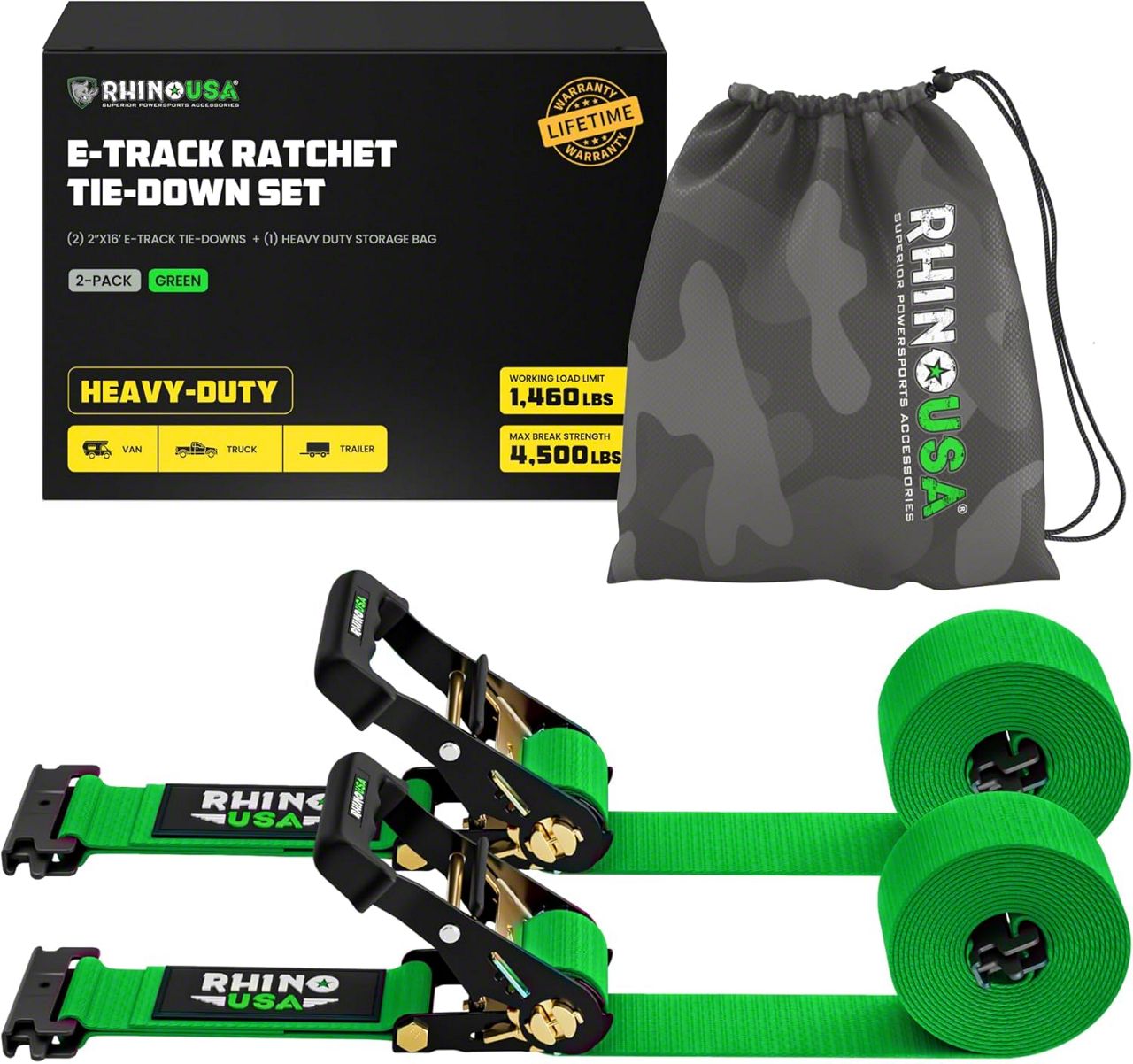 Rhino USA 2-Inch x 16-Foot E-Track Ratchet Strap Kit; 2-Pack; Green