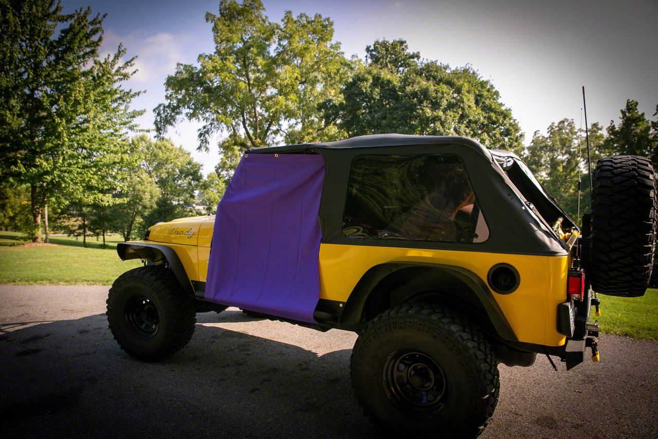 Application. These Two Door Rain Curtains; Purple fit 1987-2006 Jeep Wrangler YJs and TJs and 2007-2026 Wranglers.