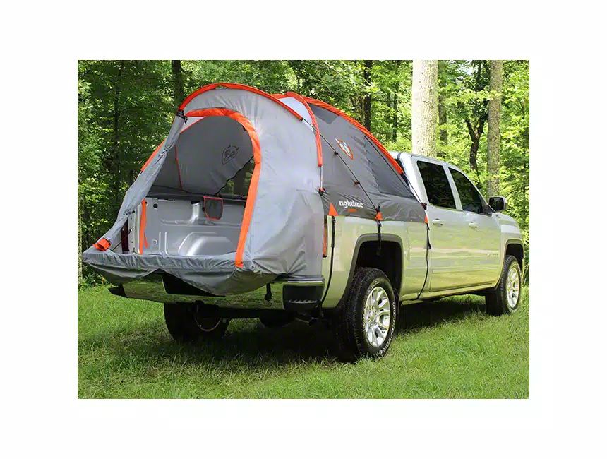 Construction and Appearance. Crafted from water-resistant fabric with tape-sealed seams, this tent is built to withstand the elements. It features large doors and windows for easy access and ventilation, along with glow-in-the-dark zipper pulls for added convenience. The tent comes in a striking orange and grey color combination, adding a stylish touch to your truck.