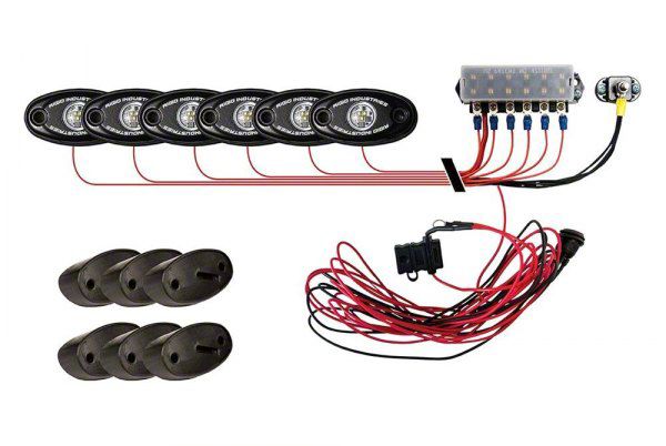 Description. The RIGID Rock Light Kit uses the power and durability of A-Series LED lighting and adds custom 15 foot leads on each light, switch and angled mounts to light up the undercarriage of any truck, Jeep, or all-terrain vehicle. This kit will allow you to light up the trail with strategically placed lights on the vehicle. Perfect for night rock crawling, the LED lights are available in a variety of colors, including white, red, blue, or amber to aid night vision or accent vehicle colors. RIGID Rock Light Kits are available in 4-light or 6-light configurations to enhance and customize your night crawling experience. Own The Night with the original LED Rock Light Kit.