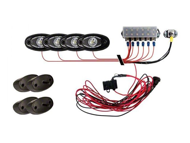 Description. The RIGID Rock Light Kit uses the power and durability of A-Series LED lighting and adds custom 15 foot leads on each light, switch and angled mounts to light up the undercarriage of any truck, Jeep, or all-terrain vehicle. This kit will allow you to light up the trail with strategically placed lights on the vehicle. Perfect for night rock crawling, the LED lights are available in a variety of colors, including white, red, blue, or amber to aid night vision or accent vehicle colors. RIGID Rock Light Kits are available in 4-light or 6-light configurations to enhance and customize your night crawling experience. Own The Night with the original LED Rock Light Kit.