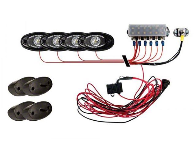 Description. The RIGID Rock Light Kit uses the power and durability of A-Series LED lighting and adds custom 15 foot leads on each light, switch and angled mounts to light up the undercarriage of any truck, Jeep, or all-terrain vehicle. This kit will allow you to light up the trail with strategically placed lights on the vehicle. Perfect for night rock crawling, the LED lights are available in a variety of colors, including white, red, blue, or amber to aid night vision or accent vehicle colors. RIGID Rock Light Kits are available in 4-light or 6-light configurations to enhance and customize your night crawling experience. Own The Night with the original LED Rock Light Kit.