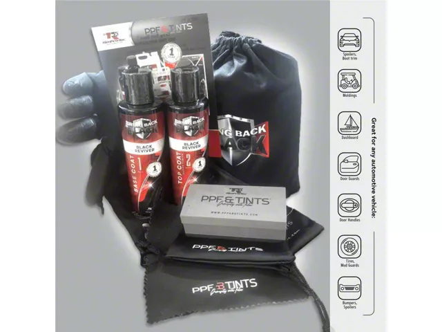 The Tire Shine and Car Plastic Restore Kit is great for any automotive, including cars, golf carts, boats, vans, and more. It's perfect for renewing and reviving the exterior and interior surfaces of your vehicle, including tires, bumpers, trim, plastic, rubber, and vinyl. The kit includes a black base coat that protects and seals in a rich carbon black, as well as a clear topcoat available in satin or gloss finish.