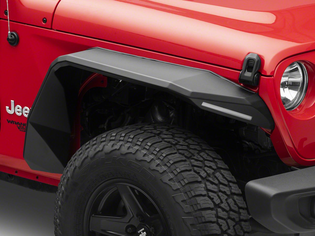 Application. This pair of Road Armor Stealth Flat Style Front Fender Flares with Switchback LED DRL are specifically designed for use on 2018-2026 Jeep Wrangler JL models. Driver and passenger side included.