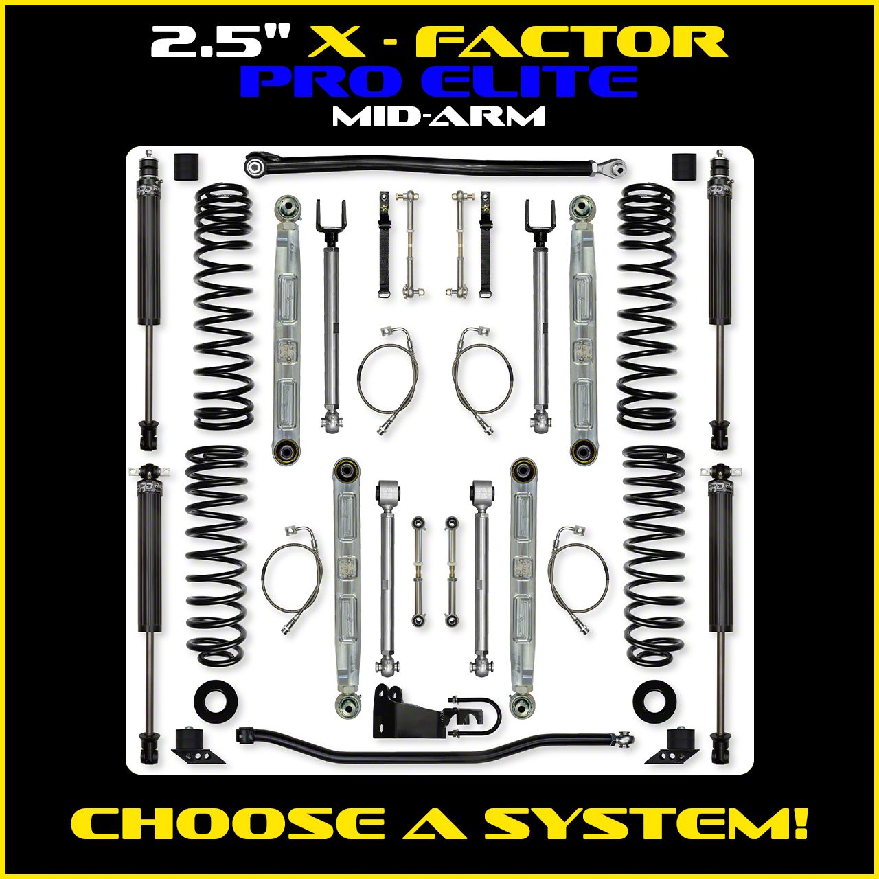The Rock Krawler 2.5" X-Factor PRO ELITE Mid-Arm System is specifically designed for Wrangler owners who want a complete system, bolt-in installation, and the best articulation of any MID-ARM kit on the market. The lower control arms are our signature PB+J (Pure Beef and Jealousy) mid-arms machined from 2” x 3” billet 7075 Aluminum. All 4 other control arms are machined from round 7075 Aluminum and come with the benefits of X-Factor built right in. Our industry leading, X-Factor Series, adjustable upper and lower control arms offer a total of 95 degrees of misalignment when paired with our Pro-X Krawler Joints and Adventure Series joints. The inherent bind in a factory JKU control arm is greatly reduced. Our maintenance free "Adventure Series" joints are found in your front and rear control arms at the frame connection, while our "PRO Krawler Joints" tie in your axle connections. With so much adjustability, it allows you to precision tune the JKU's caster and pinion angle front and rear. Driving you home with the most comfortable ride possible in a Wrangler, are our TRIPLE-RATE coils. All 4 coils work together to achieve excellent on-road comfort that we feel is better than the OEM linear rate springs. The coil itself is built with the proper "Free-length" for off-road articulation and stays firmly seated in the coil bucket (as long as a proper length shock is installed), and overall a very controlled reaction to bumps, rocks, sand, mud and whatever else you can manage to throw at them! All Rock Krawler JKU systems include correction pads that reduce the spring bow inherent in the factory set up. The provided track bar geometry corrections, both front and rear, lets you perfectly center the axles so there is no compromise in on road handling. When we design a system, our goal is to provide you with the most comprehensive solution and the best geometry, install exceptional value, and be the foundation for every adventure whether it be on the Street, In tow, or down a Trail! Thank you for considering Rock Krawler Suspension.