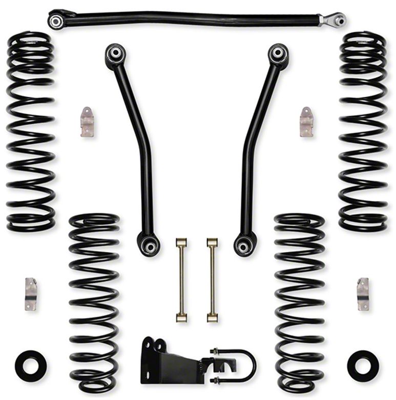 Construction and Appearance. The system includes triple-rate coil springs for superior ride quality, Bilstein 5100 shocks for consistent damping, and two non-adjustable control arms with Adventure Series joints providing 35 degrees of misalignment. Longer arms improve caster correction, while front and rear track bar geometry correction brackets and spring correction pads ensure proper alignment and reduce spring bow.
