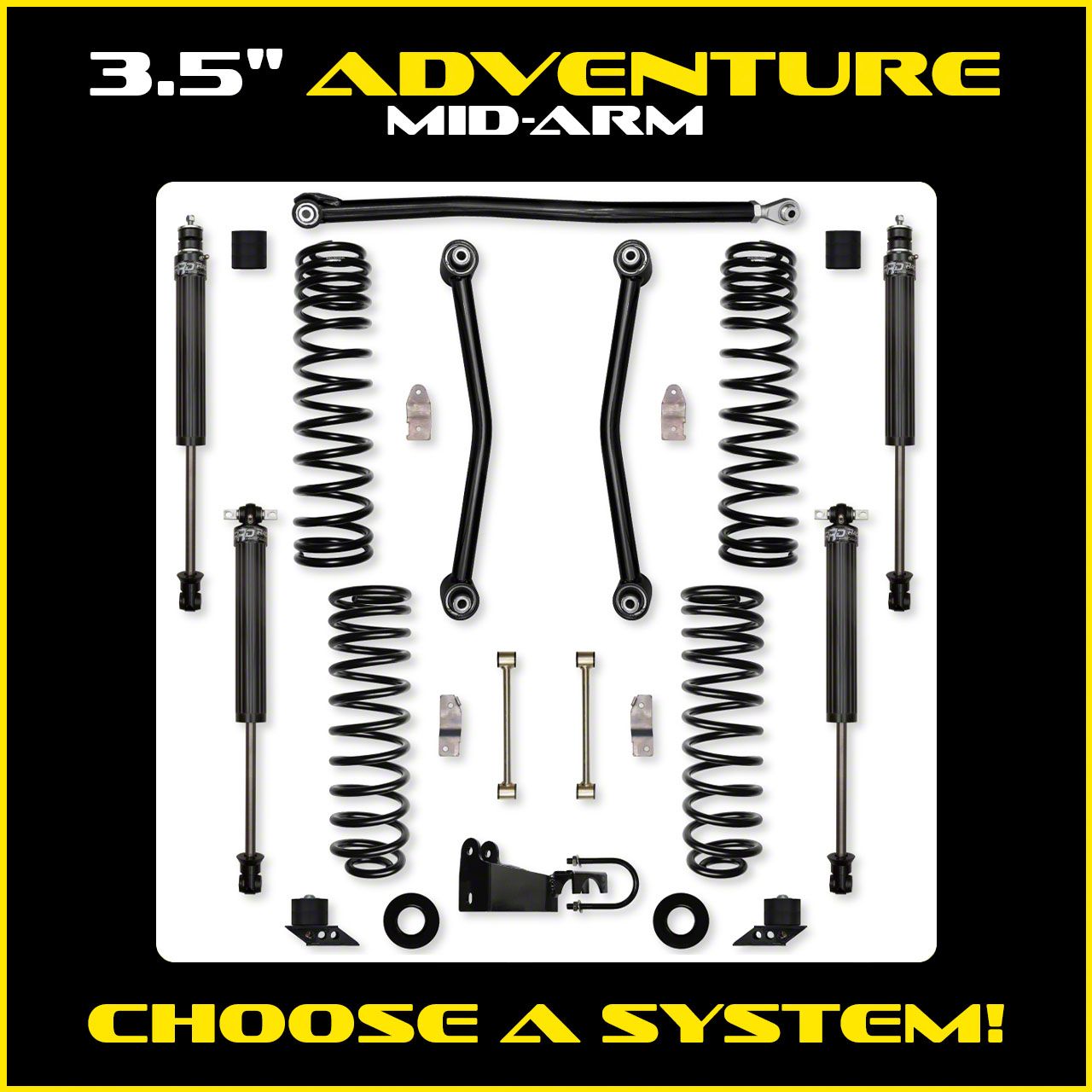 Mid-Arm Suspension Geometry. Engineered with a mid-arm design, this Rock Krawler 3.50-Inch Adventure Mid-Arm Suspension Lift Kit improves suspension geometry and handling without the complexity of a full long-arm system. The mid-arm configuration enhances stability, articulation, and ride quality, making it a versatile solution for Jeep owners who want balanced performance both on the highway and off-road.