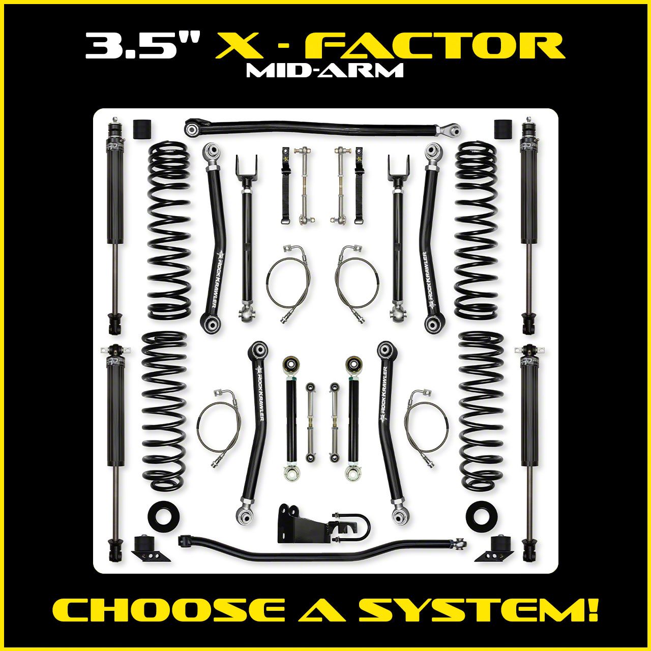 The Rock Krawler 3.5" X-Factor Mid-Arm System is specifically designed for Wrangler owners who want a complete system, bolt-in installation, and the best articulation of any MID-ARM kit on the market. Our system proves its durability and off-road performance every time you hit the streets or trail! Our industry leading, X-Factor Series, adjustable upper and lower control arms offer a total of 95 degrees of misalignment when paired with our Pro-X Krawler Joints and Adventure Series joints. The inherent bind in a factory JK control arm is greatly reduced. Our maintenance free "Adventure Series" joints are found in your front and rear control arms at the frame connection, while our "PRO Krawler Joints" tie in your axle connections. With so much adjustability, it allows you to precision tune the JK's caster and pinion angle front and rear. Driving you home with the most comfortable ride possible in a Wrangler, are our TRIPLE RATE coils. All 4 coils work together to achieve excellent on-road comfort that we feel is better than the OEM linear rate springs. The coil itself is built with the proper "Free-length" for off-road articulation and stays firmly seated in the coil bucket (as long as a proper length shock is installed), and overall a very controlled reaction to bumps, rocks, sand, mud and whatever else you can manage to throw at them! All Rock Krawler JK systems include correction pads that reduce the spring bow inherent in the factory set up. The provided track bar geometry corrections, both front and rear, lets you perfectly center the axles so there is no compromise in on road handling. When we design a system, our goal is to provide you with the most comprehensive solution and the best geometry, install exceptional value, and be the foundation for every adventure whether it be on the Street, In tow, or down a Trail! Thank you for considering Rock Krawler Suspension.