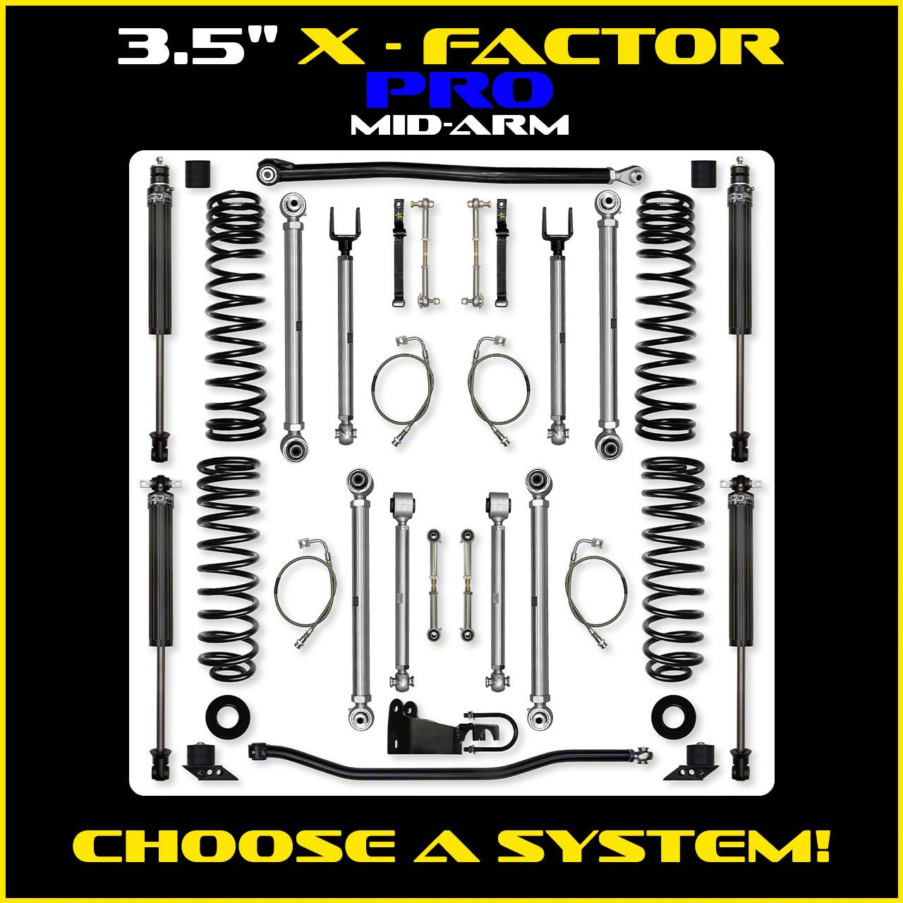 The Rock Krawler 3.5" X-Factor PRO Mid-Arm System is specifically designed for Wrangler owners who want a complete system, bolt-in installation, and the best articulation of any MID-ARM kit on the market. ALL 8 CONTROL ARMS ARE MADE FROM SOLID 7075 ALUMINUM, AND COME STANDARD WITH ALL BENEFITS OF X-FACTOR BUILT RIGHT IN. Our system proves its durability and off-road performance every time you hit the streets or trail! Our industry leading, X-Factor Series, adjustable upper and lower control arms offer a total of 95 degrees of misalignment when paired with our Pro-X Krawler Joints and Adventure Series joints. The inherent bind in a factory JK control arm is greatly reduced. Our maintenance free "Adventure Series" joints are found in your front and rear control arms at the frame connection, while our "PRO Krawler Joints" tie in your axle connections. With so much adjustability, it allows you to precision tune the JK's caster and pinion angle front and rear. Driving you home with the most comfortable ride possible in a Wrangler, are our TRIPLE-RATE coils. All 4 coils work together to achieve excellent on-road comfort that we feel is better than the OEM linear rate springs. The coil itself is built with the proper "Free-length" for off-road articulation and stays firmly seated in the coil bucket (as long as a proper length shock is installed), and overall a very controlled reaction to bumps, rocks, sand, mud and whatever else you can manage to throw at them! All Rock Krawler JK systems include correction pads that reduce the spring bow inherent in the factory set up. The provided track bar geometry corrections, both front and rear, lets you perfectly center the axles so there is no compromise in on road handling. When we design a system, our goal is to provide you with the most comprehensive solution and the best geometry, install exceptional value, and be the foundation for every adventure whether it be on the Street, In tow, or down a Trail! Thank you for considering Rock Krawler Suspension.