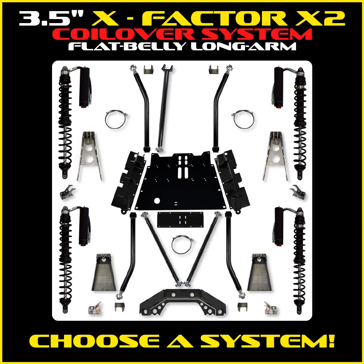 The Rock Krawler Suspension 3.5" X-Factor X2 Flat-Belly COILOVER Long-Arm System is a massive evolution to long-arm systems for LJ Wranglers. This incredible system allows you to add a full, weld-in Coilover system front suspension, and keep a traditional spring and shock rear setup. We led the way with the Revolutionary X-Factor Long-Arm design featuring the industry's first Independent 3-Link Front and Triangulated 4-Link Rear Suspension Design Ever! The X-Factor Long-Arm design has stood the test of time and has been mimicked by many other companies in its 20+ year history! How do we as an industry leader blow something out of the water that has done so well for so long? The answer is the all new LJ X Factor X2 Flat Belly Long-Arm Systems. The industry’s only full flat belly long-arm system where all the arms tuck up right inside the frame! The X-Factor X2 geometry is enhanced above and beyond our old X-Factor Long-Arm, adding more double triangulation to the rear for even better stability. The ride quality has also improved by adding our Adventure Series Joints to the frame side of the lower control arms and thus reducing overall system maintenance. The newer Pro-X Krawler Joints with the one piece BASF thermo-elastomer material round out the joints used in the system for an unbelievable 95 degrees of misalignment or more, available on each and every control arm in the system. Of course, these systems come with our technologically advanced and tuned Triple-Rate Coils Front and Rear. No one can beat this combination of cross over angles, ground clearance gains, ride quality, tuned suspension performance, durability and our abuse proof lifetime warranty on all hard parts. The Rock Krawler X-Factor X2 Flat Belly Long-Arm System is paving the way for future LJ Builds.
