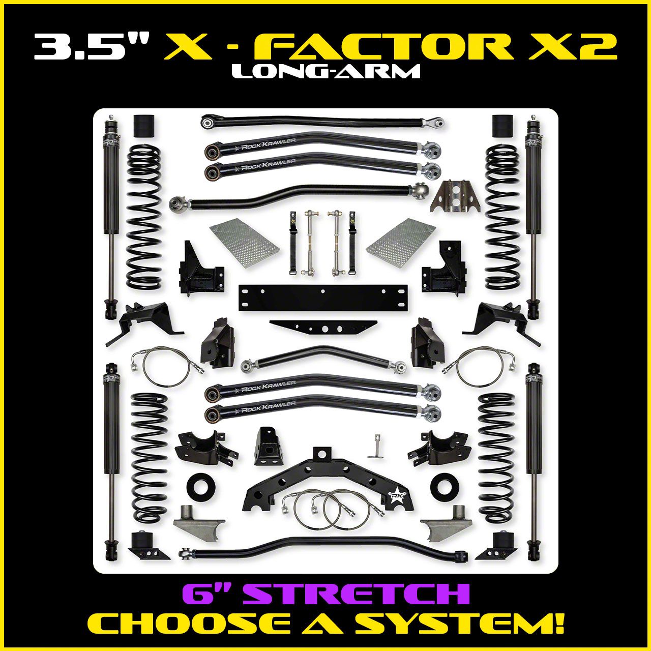The Rock Krawler Suspension 3.5" X - Factor X2 Long-Arm 6" STRETCH System is the ultimate in compromise between daily driver/hard core off-roader. The X - Factor systems combine the benefits of a full high clearance independent 3 link front suspension with a high clearance independent 3 link rear suspension. This is where conventional on road handling meets bad ass off-road ability. Up Front we have our proven 3 - link geometry with larger than factory hardware, a double adjustable front upper arm and wider than factory mounting width at the axle. This makes for an incredibly strong setup that is fit for the highways of America or any trail you may traverse all while providing maximum articulation at peak performance. The rear system uses our tried and true independent 3 link conversion with X2 rear suspension geometry with enhanced rear instant center(s) and rear roll center(s). We provide the necessary brackets and control arms needed to achieve a 6" rear suspension stretch in order to give an enhanced wheelbase. This helps with greater off-road capability and better on-road handling characteristics in a 2-door wrangler. The new high clearance axle mounts provide 3.5” of ground clearance under the rear axle as compared to stock. The rear upper shock relocation brackets ensure you do not lose any shock or suspension travel. The combination of a full high clearance independent 3 link long-arm front suspension and high clearance independent 3 link rear long-arm suspension lets you dominate the streets and the trails. When we design a system, our goal is to provide you with the most comprehensive solution and the best geometry, install exceptional value, and be the foundation for every adventure whether it be on the Street, In tow, or down a Trail! Thank you for considering Rock Krawler Suspension.