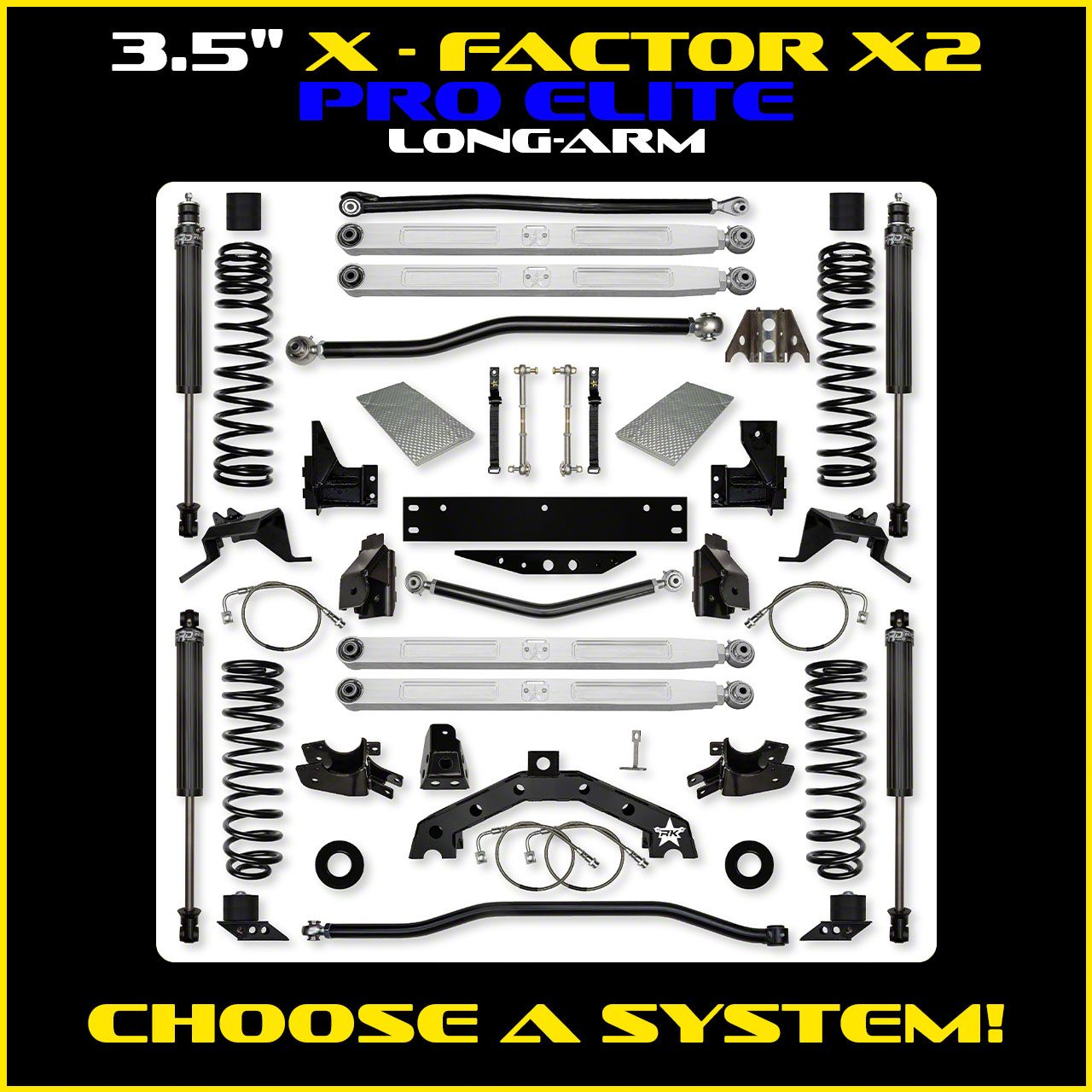 The Rock Krawler Suspension 3.5" X - Factor X2 PRO Long-Arm System is the ultimate in compromise between daily driver/hard core off-roader. "PRO ELITE" derives from having a set of PB&J (Pure beef and jealousy) BILLET aluminum lower control arms. These arms are custom machined in-house, built using a solid square stock bar of billet aluminum and engineered to quite literally, handle any abuse you can throw at them. The X - Factor X2 systems combine the benefits of an independent 3 link front and rear suspension. This is where conventional on road handling meets bad ass off-road ability. Our proprietary design utilizes a double adjustable front and rear upper control arm that upsizes the factory hardware to 14mm, 2 3/8" mounting width and 1" Pro Krawler joints at one end. The arm itself is a chromoly solid steel arm meant to carry all the forces of the suspension. The rear system uses our tried and true independent 3 link conversion with X2 rear suspension geometry with enhanced rear instant center(s) and rear roll center(s). The new high clearance axle mounts provide 3.5” of ground clearance under the rear axle as compared to stock. The rear upper shock relocation brackets ensure you do not lose any shock or suspension travel. The combination of independent 3 link long-arm front and rear suspension lets you dominate the streets and the trails. When we design a system, our goal is to provide you with the most comprehensive solution and the best geometry, install exceptional value, and be the foundation for every adventure whether it be on the Street, In tow, or down a Trail! Thank you for considering Rock Krawler Suspension.