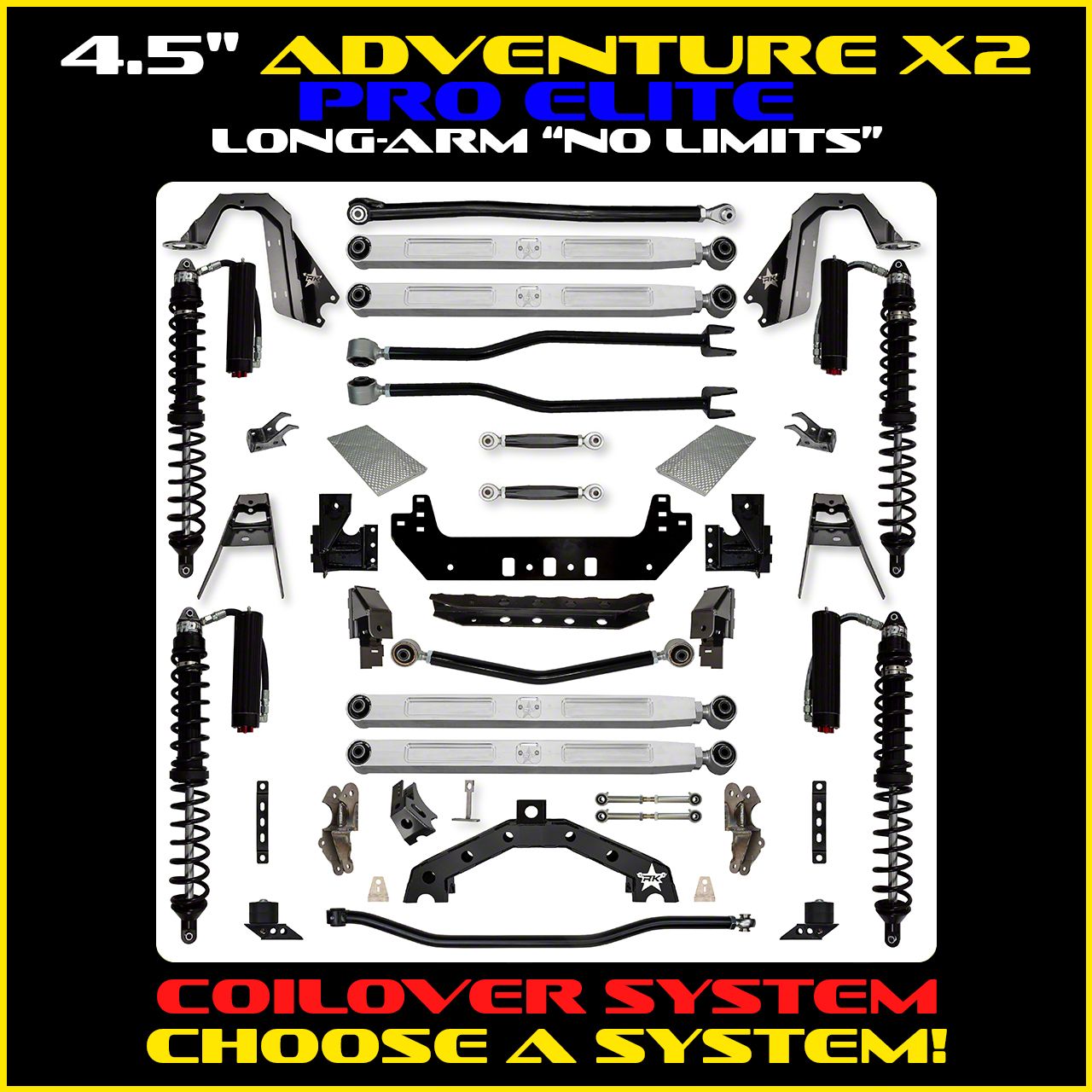 The Rock Krawler 4.5" Adventure - X2 PRO ELITE COILOVER "No Limits" Long-Arm System is the ultimate in compromise between daily driver/hard core off-roader. The "PRO ELITE" signifies you are entering the realm of PB&J (PURE BEEF AND JEALOUSY) by purchasing a system that is outfitted with 4 BILLET ALUMINUM CNC MACHINED SERVICE FREE lower control arms in a long arm length! This is as good as it gets; absolute strength, paired with a maintenance free peace of mind will have you blasting down any trail in America! The Adventure-X2 systems combine the benefits of a full high clearance 4 link front suspension with a high clearance independent 3 link rear suspension. Say goodbye to greasing your joints, our service free longarm system is here to stay. In every single control arm, we have our Adventure series joint center, which isolates harsh road vibrations equivalent to an OE bushing, includes high misalignment, and is fitted with a steel sleeve (that the bolt passes through) which rotates freely on a additional Teflon lined inner sleeve to insure that you are never chafing, twisting, or deforming the bushing material inside the housing as you blast through the mud, sand, sleet, salt, snow, dirt and dust. To finish it off, as you tighten your control arms into the mounts, the sleeve of the joint is engineered to be the buffer between the clamping force of a bracket, which means that as you tighten everything, you are not compressing the bushing. This all makes for an incredibly long lasting joint that never requires a drop of grease, and makes zero noise inside the housing. This is where conventional on road handling meets bad ass off-road ability. With enhanced rear instant center(s) and rear roll center(s), X2 rear suspension geometry is the smoothest riding 3-Link suspension you can take down a trail or cruise across America in your Wrangler. The new high clearance axle mounts provide 4.5” of ground clearance under the rear axle as compared to stock. The rear upper shock relocation brackets ensure you do not lose any shock or suspension travel. The combination of a full high clearance 4-link long arm front suspension and high clearance independent 3 link rear long arm suspension lets you dominate the streets and the trails. The billet “No Limits” front sway bar end links pair amazingly well with the factory Rubicon E Disconnect ensuring bind free suspension travel in the roughest of terrains.