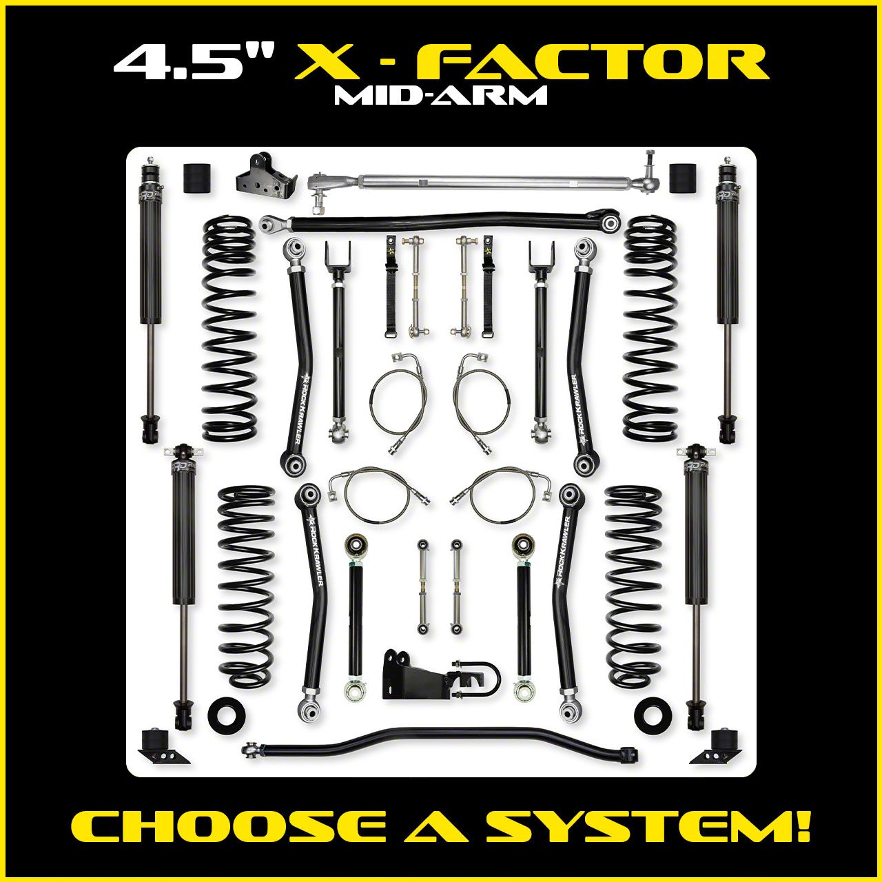 The Rock Krawler Suspension 4.5" X-Factor Mid-Arm System is specifically designed for Wrangler owners who want a complete system, bolt-in installation, and the best articulation of any MID-ARM kit on the market. Our system proves its durability and off-road performance every time you hit the streets or trail! Our industry leading, X-Factor Series, adjustable upper and lower control arms offer a total of 95 degrees of misalignment when paired with our Pro-X Krawler Joints and Adventure Series joints. The inherent bind in a factory JK control arm is greatly reduced. Our maintenance free "Adventure Series" joints are found in your front and rear control arms at the frame connection, while our "PRO Krawler Joints" tie in your axle connections. With so much adjustability, it allows you to precision tune the JK's caster and pinion angle front and rear. Driving you home with the most comfortable ride possible in a Wrangler, are our TRIPLE-RATE coils. All 4 coils work together to achieve excellent on-road comfort that we feel is better than the OEM linear rate springs. The coil itself is built with the proper "Free-length" for off-road articulation and stays firmly seated in the coil bucket (as long as a proper length shock is installed), and overall a very controlled reaction to bumps, rocks, sand, mud and whatever else you can manage to throw at them! All Rock Krawler JK systems include correction pads that reduce the spring bow inherent in the factory set up. The provided track bar geometry corrections, both front and rear, lets you perfectly center the axles so there is no compromise in on road handling. When we design a system, our goal is to provide you with the most comprehensive solution and the best geometry, install exceptional value, and be the foundation for every adventure whether it be on the Street, In tow, or down a Trail! Thank you for considering Rock Krawler Suspension.