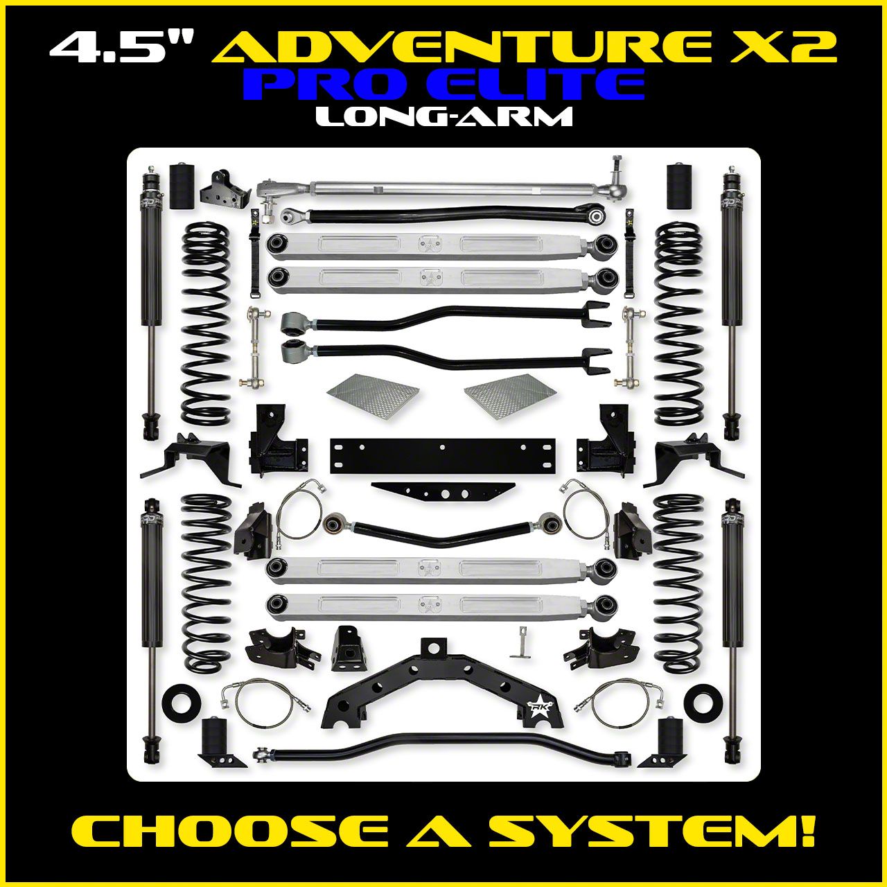 The Rock Krawler Suspension 4.5" Adventure X2 PRO ELITE Long-Arm System is the ultimate in compromise between daily driver/hard core off-roader. The Adventure-X2 systems combine the benefits of a full high clearance 4 link front suspension with a high clearance independent 3 link rear suspension. The "PRO ELITE" signifies you are entering the realm of PB&J (PURE BEEF AND JEALOUSY) by purchasing a system that is outfitted with 4 BILLET ALUMINUM CNC MACHINED SERVICE FREE lower control arms in a long-arm length! Say goodbye to greasing your joints, our service free long-arm system is here to stay. In every single control arm, we have our Adventure series joint center, which isolates harsh road vibrations equivalent to an OE bushing, includes high misalignment, and is fitted with a steel sleeve (that the bolt passes through) which rotates freely on a additional Teflon lined inner sleeve to insure that you are never chafing, twisting, or deforming the bushing material inside the housing as you blast through the mud, sand, sleet, salt, snow, dirt and dust. To finish it off, as you tighten your control arms into the mounts, the sleeve of the joint is engineered to be the buffer between the clamping force of a bracket, which means that as you tighten everything, you are not compressing the bushing.