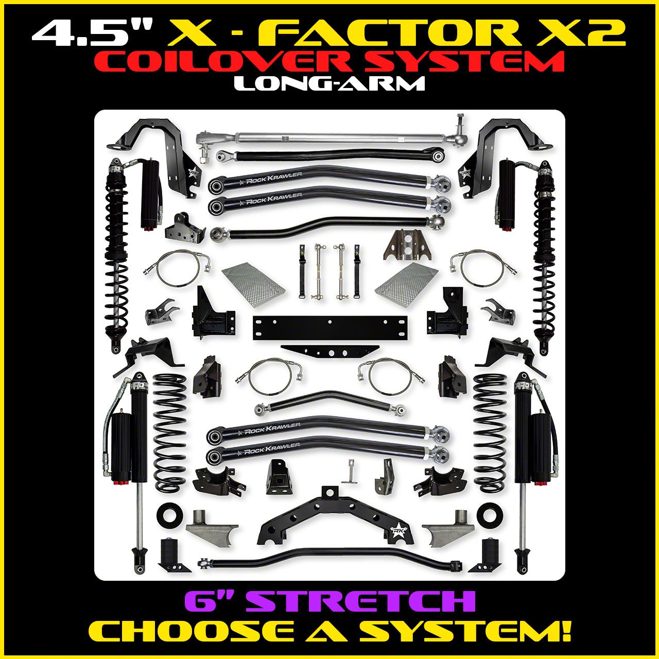 The Rock Krawler Suspension 4.5" X - Factor X2 6" Stretch COILOVER Long-Arm System is the ultimate in compromise between daily driver/hard core off-roader. The X - Factor X2 systems combine the benefits of a full high clearance independent 3 link front suspension with a high clearance independent 3 link rear suspension. This is where conventional on road handling meets bad ass off-road ability. Our proprietary design utilizes a double adjustable front and rear upper control arm that upsizes the factory hardware to 14mm, 2 3/8" mounting width and 1" Pro Krawler joints at each end. The arm itself is a chromoly solid steel arm meant to carry all the forces of the suspension. The rear system uses our tried and true independent 3 link conversion with X2 rear suspension geometry with enhanced rear instant center(s) and rear roll center(s). We provide the necessary brackets and control arms needed to achieve a 6" rear suspension stretch in order to give an enhanced wheelbase. This helps with greater off-road capability and better on-road handling characteristics in a 2-door wrangler. The new high clearance axle mounts provide 3.5” of ground clearance under the rear axle as compared to stock. The rear upper shock relocation brackets ensure you do not lose any shock or suspension travel. The combination of a full high clearance independent 3 link long-arm front suspension and high clearance independent 3 link rear long-arm suspension lets you dominate the streets and the trails. The Comp System (Front Coilovers w/ Rear Coil Combination) is ideal for those that want the adjustability and performance of coilover racing shocks up front, but still want to use their Wrangler to carry small loads or tow small trailers. There are two options for the Comp Systems you can choose from. The standard or Stage 1 System features 2 5/8" RRD Racing Coilovers w/ Remote Reservoirs up front paired with matching 2 5/8" RRD Racing Shocks w/ Remote Reservoirs in the rear for a well tuned package. Or you can opt for the Stage 2 Comp System which will include Fast CD (Compression Dampening) Adjusters on the coilovers and rear shocks for an even greater level of tuneability. When we design a system, our goal is to provide you with the most comprehensive solution and the best geometry, install exceptional value, and be the foundation for every adventure whether it be on the Street, In tow, or down a Trail! Thank you for considering Rock Krawler Suspension.
