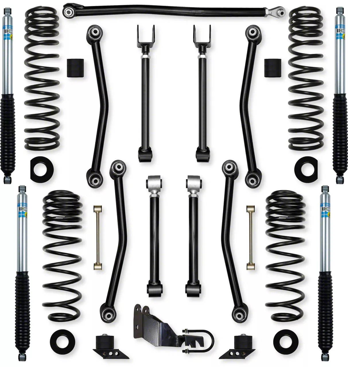Construction and Appearance. Constructed with premium quality components, the lift system features a pair of non-adjustable control arms with 100% service-free joints, triple rate coil springs for a comfortable driving experience, and a firm, controlled coil that withstands all elements. The system also includes an adjustable front track bar for precise alignment and reduced bind and correct caster up front.
