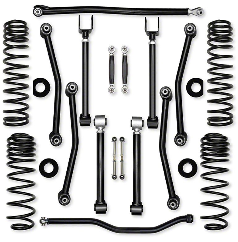 Construction and Appearance. Built for durability, this lift system includes adjustable, high-clearance control arms that help avoid obstacles, allowing for smoother and safer off-road adventures. Paired with high-performance Bilstein 5100 shocks, the system ensures superior damping and control, ideal for handling uneven surfaces and enhancing ride comfort.