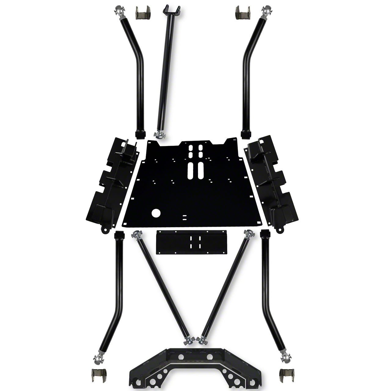 Construction and Appearance. Finished in matte black, the upgrade centers on an independent front 3-link and a double-triangulated rear 4-link, designed to control axle movement and reduce bind through the stroke. Heavy-duty long arms, reinforced mounts, and a flat-belly skid strategy improve breakover while distributing loads into stronger frame and axle points. Precision-formed components and quality hardware support repeatable alignment, better anti-squat/anti-dive characteristics, and quiet operation, all while resisting corrosion and trail abuse over the long haul.