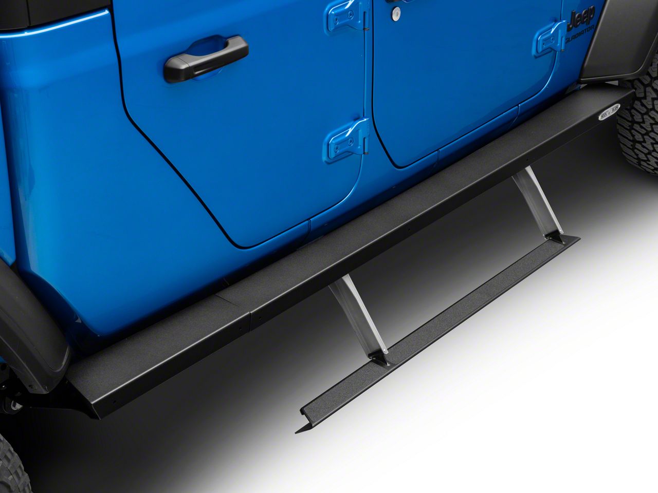 Functional Solid Steps. If you’re looking to add side steps to your Jeep Gladiator, then opt for these Rock-Slide Engineering Step Sliders. These functional solid steps provide safer vehicle access since they are automatically dropped down up to 12 inches every time you open your truck’s door. With this low drop, it's also one of the best slider options for lifted Gladiators.