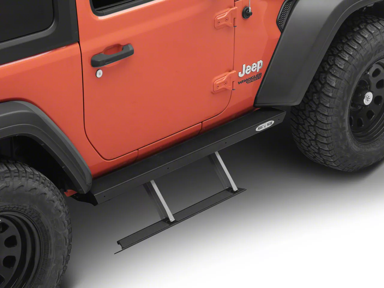 Add Functionality and Protection with the Rock-Slide Engineering Step Slider. The Rock-Slide Engineering 3rd Gen Step Slider provides your 2018-2026 Jeep Wrangler JL 2-Door with an automatic retractable step for easy access to the vehicle, especially for lifted models. This step extends when you open the door and retracts when closed, providing extra ground clearance and protection during off-road adventures.
