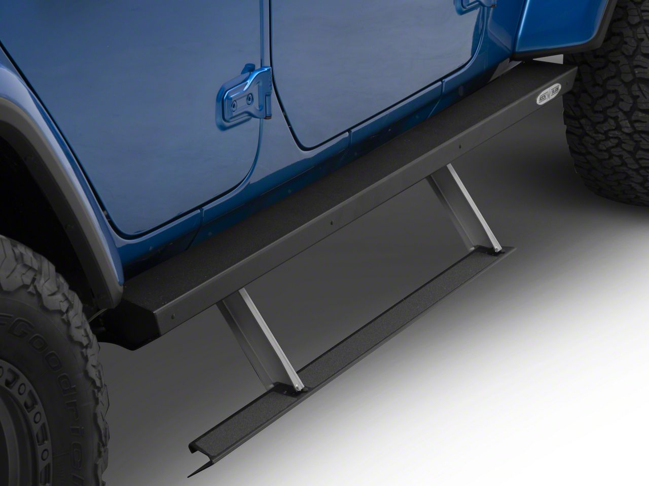 Construction and Appearance. Manufactured in the USA, these step sliders showcase exceptional craftsmanship with their black textured powder-coated finish, which provides extra protection against the elements and adds a sleek, rugged look to your vehicle. The integration of a smart motor ensures that the step automatically deploys and retracts, blending seamlessly with the Jeep's design while offering practicality and protection.