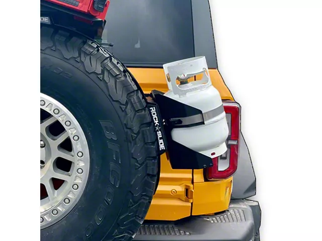 Cooking and Heating Essential. Introducing the Rock-Slide Engineering Propane Tank Holder - the ultimate solution for your outdoor cooking and heating needs. With the ability to securely hold a 5-pound propane tank, this accessory mounts directly to the EZ Rack or Overland Rack, ensuring a stable and convenient storage solution. Now you can effortlessly carry your fuel tank, ensuring you're always prepared for your outdoor adventures.