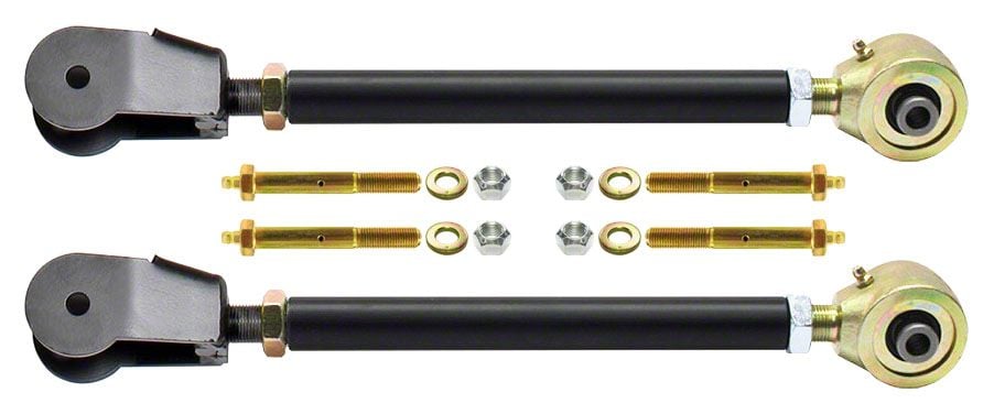 Design. The double adjustable feature of these RockJock Johnny Joint Double Adjustable Front Upper Control Arms permits precise suspension tuning. With independent adjustability for both the length and the angle of the control arms, you have the flexibility to fine-tune your suspension setup. This adjustability empowers you to optimize suspension geometry, axle positioning, and pinion angle to suit your specific driving needs and preferences.
