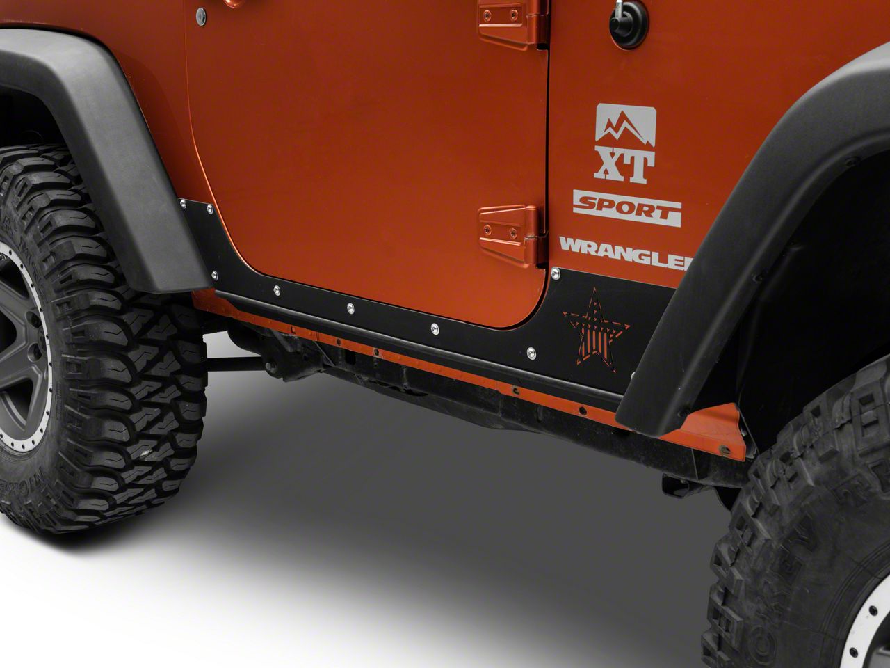 Heavy-Duty Build Quality. Rock-Slide Engineering Step Slider Rocker Guards are constructed from 0.090-inch thick aircraft aluminum for excellent corrosion resistance, as well as strength minus the weight. These rocker guards are precision cut for an OE-like fit on your Jeep and feature the stars and stripes logo for an eye-catching look. Bringing its design together is a textured black powder-coat finish that adds corrosion protection, as well as a tough look.